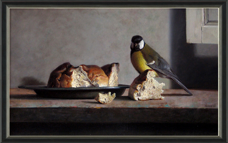 open venster staat. Een alert koolmeesje heeft het broodstilleven ontdekt en is naar