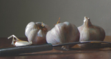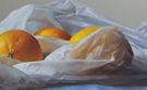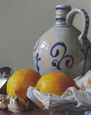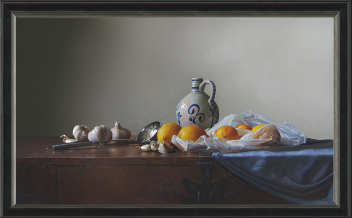 Eén van de uitdagingen van een realistische schilder is om de aard van het oppervlak van een object (de textuur) zo goed mogelijk in verf uit te drukken. In vaktaal heet dat de benadering van de stofuitdrukking. Een groffe baksteen zal anders geschilderd worden dan een donzig veertje. De verf zal bij beide objecten op een verschillende manieren op het paneel worden aangebracht. De baksteen zal bij wijze van spreke met groffe kwast en palletmes geschilderd worden terwijl het veertje met een zachte penseelstreken wordt neergezet. Door te werken aan een mooie stofuitdrukking wil je de kijker bijna visueel laten ervaren hoe het oppervlak van het voorwerp zal aanvoelen. In deze compositie heb ik me heerlijk kunnen uitleven in het schilderen van verschillende texturen. Gladde oppervlakken zoals de ijzeren opscheplepel en de vaas, tegenover de vormloze objecten als de plastic zak en het blauwe doek. Door verschillende texturen naast elkaar te zetten gaan de ongelijk gestemde voorwerpen als het ware een strijd met elkaar aan wat een interessant beeld oplevert. Zie het contrast tussen de vormloze krakende zak tegenover de sierlijke porseleinen kruik. Ook heb ik geprobeerd voorwerpen uit te kiezen die ogenschijnlijk qua vorm overeenkomen maar weer onderlinge verschillen hebben: De citroenen en knoflook zijn beide organische vormen maar de knoflook heeft een schilferend oppervlak en de citroen juist een glad oppervlak. Vergelijk op die manier ook de plastic zak met het blauwe doek, die samen dat vormloze en plooiende karakter hebben, maar totaal verschillen qua textuur. Zo matcht ook de porseleinen kruik met de ijzeren lepel. De grootste uitdaging om te schilderen was dan ook wel de plastic zak, die had ik immers nog nooit eerder geschilderd. De studie naar de complexiteit van al die vouwen en glinsteringen is al een hele onderneming op zich. Daarnaast is het plastic ook nog half transparant en ligt er dus de uitdaging in dit alles zo overtuigend mogelijk te schilderen. Ook niet zo gemakkelijk is het schilderen van de ijzeren lepel, waar mijn atelier op de kop wordt in weerspiegeld. Als men mij vraagt: “Hoe krijg je dat allemaal zo voor elkaar? “ is mijn antwoord in eerste instantie:”Goed kijken en schilderen wat je ziet en niet schilderen wat je DENKT te zien. Wil je een voorwerp optimaal schilderen zul je het eerst goed van dichtbij moeten bekijken om het oppervlak goed te kunnen doorgronden. Uiteindelijk zullen die onverwachte details het schilderij levendig maken.