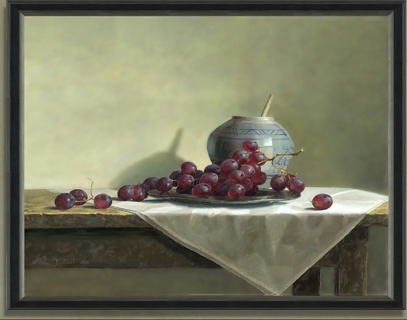 Door de grote gemberpot op de achtergrond van de druiventros te zetten, creëer ik een referentiekader, zodat de kijker een indruk krijgt hoe groot de druiventros wel niet is. Tevens is op de gemberpot een afbeelding zichtbaar van de twee verspieders die de omvangrijke druiventros met een draagstok meenemen. Het bijbelverhaal wil duidelijk maken dat het land Kanaän mooi en vruchtbaar was. Ook dit schilderij wil die bepaalde schoonheid sugereren en aan de kijker overbrengen.