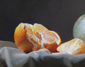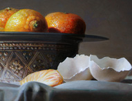 Ik kan me voorstellen dat men bij deze titel niet direct zo’n stilleven verwacht. Bij geboorte denken we al gauw aan het op de wereld komen van een kind of nieuw leven en niet aan zo’n tafereel. Het stilleven is dan ook een beetje van toepassing op mijn eigen leven. Rond maart verwacht ik namelijk zelf de geboorte van mijn eerste kind mee te maken en daarom besloot ik een klein stilleven te wijden aan deze heugelijke verwachting. Stillevens zijn voor mij altijd een middel geweest waarin ik door middel van symboliek mijngedachten kan uitbeelden. Ik vind het aangenaam om met symboliek te werken, omdat het de overdracht wat indirecter maakt, wat weer aanzet tot nadenken. Je kunt mooie maar ook minder mooie gebeurtenissen uitbeelden zonder daarbij direct confronterende beelden bij te gebruiken. Een jaar geleden had ik als nieuwjaarskaart het schilderij “Weggenomen”. Het was een warmkleurig stilleven, maar de verborgen boodschap was minder vrolijk. Ondanks dit minder vrolijke thema is het schilderij “Geboorte” hier wel een vervolg op geworden. Als je de schilderijen bij elkaar zou hangen, zou je overeenkomsten kunnen zien: op beide schilderijen zijn mandarijnen te zien, bij “Weggenomen” zijn geen losse mandarijnschijfjes te zien en hier echter wel. Ook komt op beide stillevens een vaasje voor. Een essentieel verschil is dat het vaasje op het schilderij “Weggenomen” gesloten is en bij “Geboorte” open is. De vaas staat in de traditionele symboliek voor het vrouwelijke, vanwege de vorm ook wel verwijzend naar de baarmoeder. Op deze plek begint al het leven. 9 maanden lang zal de vrucht zich daar ontwikkelen tot een klein kind om vervolgens ter wereld te komen. Zo gaat het ook veelal in de natuur, bijna al het leven begint eerst in een rond beschermende omhulsel. Vergelijk het maar in dit geval met de mandarijn. Binnen de beschermende oranje schil, groeien langzaam de vruchten tot volle rijpheid. In dit stilleven heb ik bij wijze van geboorte een open mandarijn geschilderd met rechts daarvan een “uitgekomen” mandarijnvrucht. Aan de rechter kant wordt de geboorte nogmaals uitgebeeld door het oeroude symbool van het ei. Het ei is open gebroken en ook aan de voet van deze eieren ligt een schijfje mandarijn. In de zilveren schaal op de achtergrond zien we 4 mandarijnen liggen wat straks het aantal gezinsleden uitbeeld. Het is wellicht vooruitlopen op de zaken, want het is nog niet zover. Maar het mooie van een stilleven met een algemeen thema als “geboorte” is, dat iedereen daar zijn eigen gedachte over mag hebben. En is een thema als geboorte niet een prachtig thema rond de kersttijd?