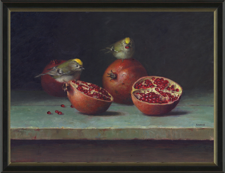 Het goudhaantje of ook wel in het Latijn genoemd de Regulus regulus, is het kleinste vogeltje van Europa. Hij komt vrijwel in heel Europa voor, maar is vrij schuw en wordt daarom niet vaak opgemerkt. Mijn collega Rutger Hiemstra liet mij onlangs het vogeltje zien dat tegen het raam was gevlogen. Hij had het laten opzetten, voor die tijd had ik een goudhaantje nog nooit in het echt gezien. Opvallend is zijn grootte, maar misschien nog wel meer dat doordringende geel van het kuifje. Ik mocht het opgezette exemplaar lenen om het te gebruiken voor een schilderij en zo ontstond dit tafereel. Het goudhaantje heeft in onze taal ook een andere betekenis gekregen, het wordt ook vaak gebruikt als synoniem voor de uitverkorene, het stokpaardje om zo maar te zeggen. Als je de symboliek van vogels bekijkt in de schilderkunst staat het vaak voor de menselijke ziel (in het paradijs). Zoals een vogel opstijgt naar de hemel, zo gaat het ook met de menselijke ziel. Wat de werkelijke betekenis van dit vogeltje in dit schilderijtje is, wordt pas duidelijk als we de andere opponent in dit schilderij gaan bekijken. Dat is de granaatappel. Deze vrucht kenmerkt zich door talloze sappige vruchtjes die ingebed zijn in een harde schil. Wanneer je een enkel vruchtje open knijpt, komt er een dieprood sap uit. In de traditionele symboliek werd dit rode sap symbool voor het bloed van mensen die om het geloof gestorven zijn. De vele vruchtjes saam werden dan gezien als de kerkgemeenschap die verenigd is. De twee goudhaantjes in dit schilderij nemen wat van deze zaden tot zich en zorgen ervoor dat de zaden ergens anders weer terecht komen en kunnen groeien tot een nieuwe boom. Wat nu de betekenis is van het goudhaantje in combinatie met de granaatappel laat ik graag aan de verbeelding van de kijker over. En wie nu dat goudhaantje is mag ook een ieder voor zich bepalen.