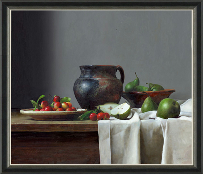 Het fruit geeft het schilderij sprankeling en frisheid en contrasteert mooi met de kleuren van het aardewerk. In heldere kleuren rood en groen is het fruit afgebeeld en laat zien dat het nog lang niet over tijd is, integendeel, geen smet is op het fruit aan te treffen. Het binnenste van peer is nog niet verbruint maar praalt sneeuwwit. En de peren zijn niet vergeeld maar zijn nog frisgroen. Die frisheid zal in vergelijking met het aardwerk echter maar van korte duur zijn, maar even op dit ogenblik ligt het er op zijn verst.