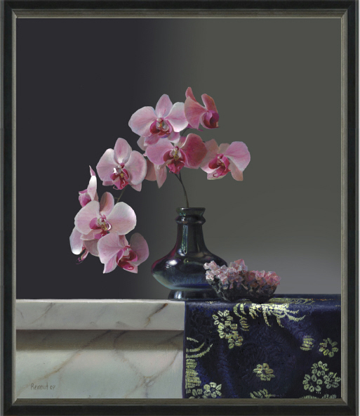 Het beeld is simpel: een orchidee in een vaasje met daarnaast een lavasteen met kristallen. De vormen zijn echter complex: als je goed naar een bloem van de orchidee kijkt gebeurt er van alles, het zijn allemaal kleine verschillende blaadjes met allerlei motieven. Hetzelfde geldt voor het kristal, op de lavasteen speelt zich een wonderlijke groei af van tientallen kristallen ieder met een eigen specifieke vorm waardoor het licht op eigen wijze doorbreekt. Deze compositie behoeft ook geen toevoeging van andere objecten, zowel de orchidee als de kristallen manifesteren een eigen perfecte schoonheid die niet aangevuld hoeft te worden. De orchidee wordt dan ook wel vaak gezien als de bloem onder de bloemen. Je doet ze niet vaak met andere bloemen in een boeket, de schoonheid van één orchidee is vaak al mooi genoeg. Toch is in deze compositie de orchidee niet alleen afgebeeld, maar in gezelschap van een met kristallen bedekte lavasteen. Het onderlinge verband dient niet zo zeer in de gemeenschappelijke kleur gezocht te worden eerder in hun symbolische waarde. Namelijk dat van de vruchtbaarheid. De orchidee doet aan haar bloemvorm veel denken aan het vrouwelijke. In combinatie met het vaasje dat vanwege zijn vorm in de traditionele symboliek staat voor de baarmoeder waaruit leven ontstaat, representeert het de vrouwelijke vruchtbaarheid. De lavasteen staat vanwege de manier waarop het vloeibare gesteente de vulkaanmond passeert voor de mannelijke vruchtbaarheid. Daar komt nog bij dat zo'n vulkaanuitbarsting vaak gepaard gaat met vuur wat het mannelijke nog eens extra benadrukt. De mannelijke en de vrouwelijke vruchtbaarheid; Waar die vruchtbaarheid toe leidt is uiteindelijk schoonheid, maar daarvoor heeft het wel een (lange) weg moeten gaan, om uiteindelijk die mooie "zwaan"te worden. De orchidee is een plant die zonder de bloem eigenlijk een onooglijke plant is: de steelbladeren zijn groot en stevig en de dunne steel steekt daar wat ieltjes tegen af. Uiteindelijk als de bloemknoppen verschijnen en open gaan dan pas komt de ware schoonheid naar voren. De weg voor deze kristallen is gelijkend. De oorsprong van de lavasteen mag duidelijk zijn. Wat ooit als kolkende massa de mond van de Etna uitspuwde, is gestold op het vaste land tot een donkere steenachtige massa. De omgeving rond de vulkaan ziet er troosteloos uit, maar tijdens het stollingsproces ontstaan op het stollende lava de prachtigste kristallen. Kristal en bloemen, beiden een sieraad en embleem van schoonheid.