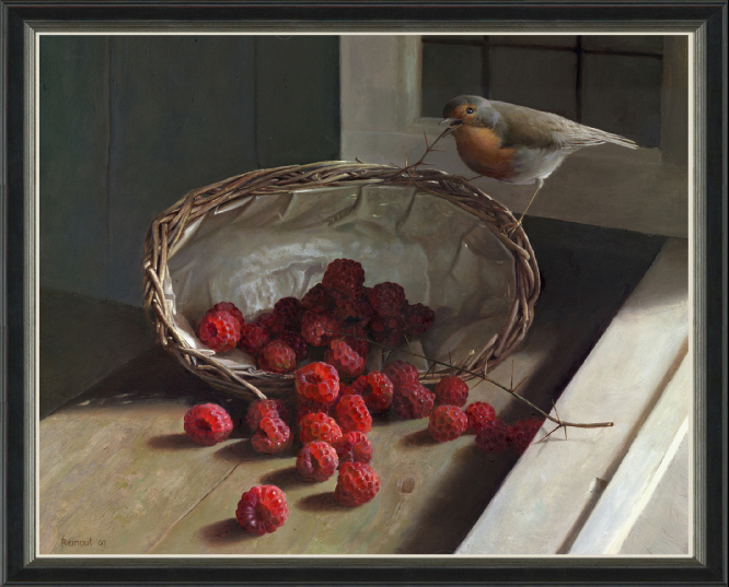 Op dit schilderij zien we een roodborstje dat via een open raam naar binnen is gevlogen. Vermoedelijk omdat zijn blik gevallen is op het felle rood van de frambozen die uit het mandje zijn gerold. Waarom het mandje is omgevallen is in eerste instantie niet geheel duidelijk. Wie weet is het een menselijke hand geweest die vluchtig vanuit het open raam geprobeerd heeft enkele vruchten te bemachtigen of was het gewoon het uitgeklapte raam dat door de wind het mandje heeft omgegooid. In ieder geval heeft Reinout weer eens een schilderijtje gemaakt waar heel duidelijk de nadruk is gelegd op de details. Het specifieke karakter van de framboos: sappig van binnen, donzig van buiten is zorgvuldig weergegeven. Ook de kleine veertjes en de fonkelende blik van het roodborstje zijn met veel zorg geschilderd. Hoewel de borst van dit vogeltje eerder oranje dan rood is, heeft hij toch de naam roodborst gekregen.