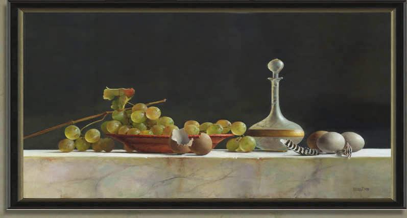 Op dit schilderij met de nogal merkwaardige titel: "Het albasten kruikje van Maria", treffen we een compositie aan die misschien in eerste instantie overkomt als een normaal stilleven. We zien een stenen schaal op een marmeren tafel en deze is gevuld met een tros groengele druiven. Daarnaast staat een leeg albasten kruikje vergezeld van wat eieren. Eén ervan is opengebroken. Zoals gezegd een normaal ogend tafereel, echter de frontale kijkhoogte en de manier waarop het licht de objecten "bestrijkt" doet vermoeden dat er toch meer gaande is. Door het lage perspectief is de ooghoogte precies gelijk aan het stilleven. De toeschouwer kijkt niet op de compositie neer, maar wordt frontaal met het beeld geconfronteerd. Hij/zij kan er met andere woorden niet om heen. Een tweede confrontatie van het beeld met de kijker is het rechts invallende licht. Dit heldere strijklicht, belicht zowel de transparante druiven, als het albasten kruikje en doet de voorwerpen fel afsteken tegen de donkere achtergrond. De objecten staan als het ware in de spotlight, wat suggereert dat ze iets zinnigs te melden hebben. De vraag rijst wat dit stilleven wil zeggen...