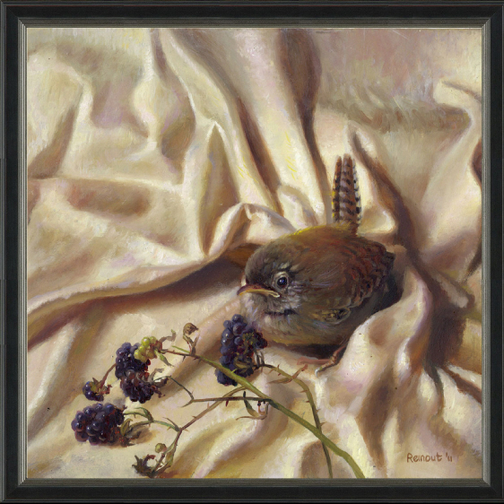 Hij draagt dan wel de titel van een koning, deze winterkoning, maar qua postuur en kleur is het maar een bescheiden vogeltje. Zijn bruine verenkleed is geen trotse tooi en zijn torso evenmin indrukwekkend. Toch is het wel een kleine Napoleon in onze tuinen. Ze zijn zeer territoriaal en met hun staartje fier in de lucht vertonen ze een zekere trots die ontzag inboezemt bij andere vogels. Maar dat is niet wat ik heb willen uitbeelden in dit kleine schilderijtje. Het is meer de kwetsbaarheid wat ik heb willen vastleggen. Hier zien we namelijk nog niet zo’n volwassen brutaal vogeltje, maar slechts een klein hulpeloos wezen met nog de tekenen van een kuikensnavel . Het trotse staartje staat dan wel omhoog maar het jonge dier is nog totaal afhankelijk van wat hem toegediend wordt. Het is geboren in een wereld die hem zowel goed als kwaad kan benaderen, de afhankelijkheid hiervan is mijns inziens kwetsbaarheid. In dit schilderij ligt hij dan ook een beetje verloren in een groot zijden doek, daar is hij ingelegd en om hem heen gevouwen. Het zachte zijde straalt zowel een zacht heenkomen uit als ook een onrustig omgeving. De plooien in het doek zijn ook als grote golven die op hem af lijken te klotsen. Dat zelfde goed en kwaad symboliseert ook de braamtak. Het voorziet in voedzame bessen, maar daarnaast schuilt ook het gevaar geprikt te worden door de scherpe doorns. Een klein schilderijtje voor een kleine kwetsbare koning.