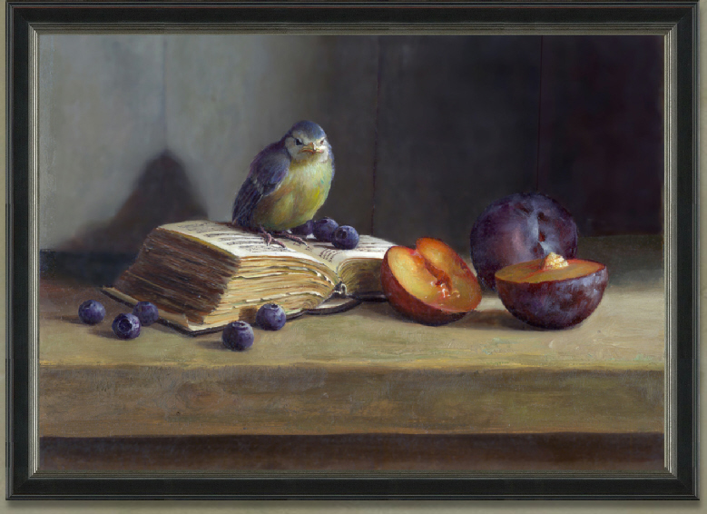 Toch worden vogels meestal geassocieerd met mooie klanken. Ik was echt blij toen ik van het dorp Godlinze in de stad Groningen ging wonen, dat gelukkig ook hier nog volop vogels zijn met hun prachtig gezang. Als een soort ode leek het me leuk om deze jonge mees op het paneel te vereeuwigen. Ik heb hem kort in het atelier genomen en neergezet op een liedboekje. De jongeling was niet erg onder de indruk, ook niet toen ik hem probeerde te voeren met wat vruchten dat ik voor handen had. De blik van het meesje was wat stoïcijns, bijna nors en deed me een beetje denken aan vroeger hoe ik als kind ook wel eens kon kijken als ik blokfluitles kreeg. Ik besloot dit schilderijtje dan ook Zangles te noemen. Het pimpelmeesje heb ik maar gauw de vrije ruimte weer gegeven en wie weet komt hij me in de toekomst nog eens bedanken voor de zangles!