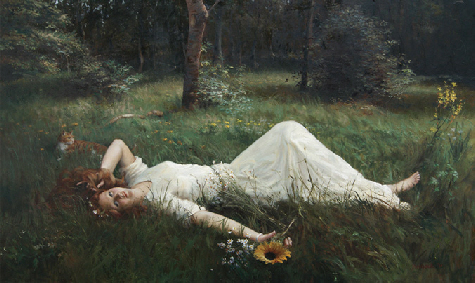 Naar het schilderij “Ophelia” van de victoriaanse schilder J.W.Waterhouse werd Martine hier geschilderd. Liggend in het gras in het bosrijke gebied rond Roden in de provincie Drenthe.