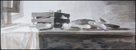Een stilleven met vissen heb ik nog niet zo vaak geschilderd. Gek genoeg was één van mijn eerste stillevens een schilderij met vissen. Dat was het schilderij “Overvloed”, dat ik in Italië schilderde. Maar daarna is het er niet meer van gekomen. Misschien ook wel omdat je een vis snel moet schilderen vanwege de kortstondige versheid. Maar de afspraak met mijn model voor het volgende figuurstuk werd uit gesteld en dus besloot ik eerst nog maar eens een fijn stilleventje te maken. Op de vismarkt in Groningen zag ik toen een paar prachtige goudgekleurde haringen. Ik kocht deze gerookte exemplaren en thuis maakte ik een compositie, waarin het goudachtige van de haring in combinatie wordt geschilderd met een zilveren beker. Hieronder enkele foto’s van de eerste opzet.