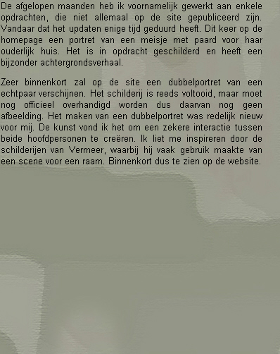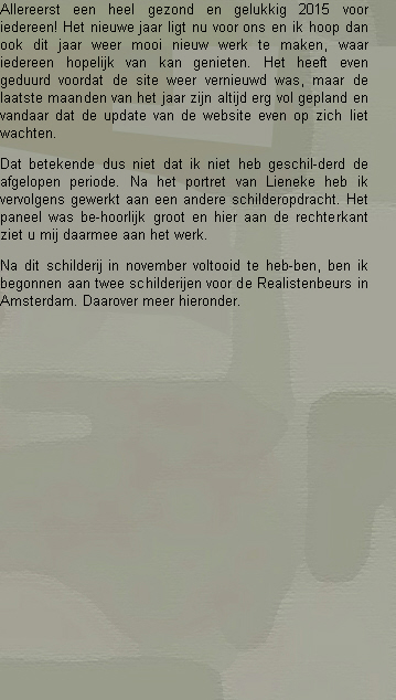 Het schilderij “Vader en zoon” heb ik begin deze maand kun-nen voltooien, zodat het te zien kon zijn op de Realistenbeurs in Amsterdam. Hebt u dit ge-mist dan is er in april wederom een tentoonstelling van figura-tieve kunst in Breda. Houdt de agenda in de gaten. De komen-de periode zal ik me weer wat meer gaan toeleggen op enkele portretopdrachten.