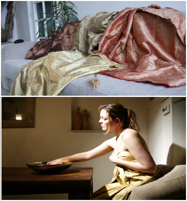 Ik wil me laten inspireren door deze tijd van het jaar, waar weer de donkere dagen voor Kerst te wachten staan. Het wordt dus een schilderij met veel licht en donker. Van een stel goede vrienden ontving ik een paar prachtige zijden doeken, die ik ook zeker wil gaan gebruiken, vermoedelijk wordt het de omslagdoek van een jonge vrouw, die in een donkere ruimte een kaars ontsteekt. Inmiddels heb ik alle enkele fotostudies gemaakt (zie hiernaast).