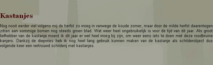 Ben de afgelopen dagen bezig geweest met de voorbereiding voor mijn vermoedelijk laatste schilderij in het jaar 2011. Traditiegetrouw zal dit schilderij dan ook de nieuwjaarskaart worden die ik ieder jaar verstuur. Kreeg u in het verleden nog geen kaart en wilt u die wel graag ontvangen, laat dat dan even weten via de contactpagina.