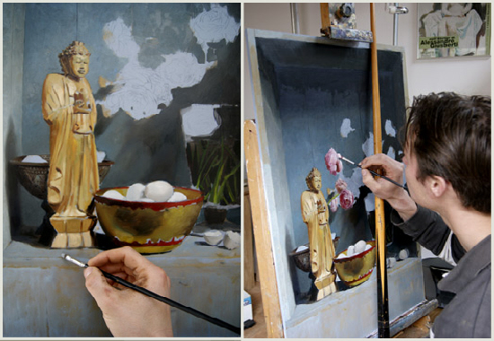 Op 15 april doe ik voor het eerst mee op de Art & Antique fair in Den Bosch. Het is min of meer een tegenhanger van de Tefaf en er zal naast schilderijen ook veel antiek te bewonderen zijn. Ik ben dan momenteel ook druk bezig met het werk dat daar bij galerie Lauswolt zal komen te hangen. Het leek me dan ook wel toepasselijk om iets in die antieke geest te schilderen. Zo mocht ik enkele antieke Japanse porseleinen sakekommetjes lenen. Ze zijn heel klein (zie foto) en daarom ook wel erg aardig om te schilderen.