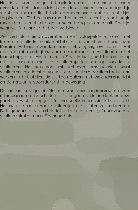 De zomer is dan wel begonnen, maar heb er nog weinig van gemerkt. Terwijl ik dit nu schrijf regent het pijpenstelen. In principe is dit weer voor het schilderen helemaal niet zo slecht. Het licht is dan niet zo hard als op een zonnige zomerdag en dat is prettiger voor het bepalen van de kleuren.