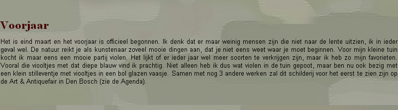 Op dit moment staat nog even niks op mijn schildersezel. Ik heb de afgelopen week mijn schilderijen laten inlijsten en heb ze gisteren naar Mariënheem gebracht, waar ze vanaf 15 juni te bezichtigen zullen zijn. Kijk voor de specifieke gegevens bij de agenda.