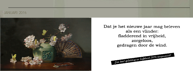 Een mooie traditie is elk jaar weer het versturen van nieuwjaarskaarten. De stapel groeit ieder jaar weer een beetje meer, maar het is een mooi moment van persoonlijke aandacht in dit geval voor iedereen die mijn werk graag op de voet volgt. Voelt u zich aangesproken en kreeg u in het verleden nog geen nieuwjaarskaart, laat via de mail even uw adres achter dan krijgt u deze keer ook de kaart opgestuurd. Op de kaart staat dit jaar het schilderij dat nu op de homepage staat.
