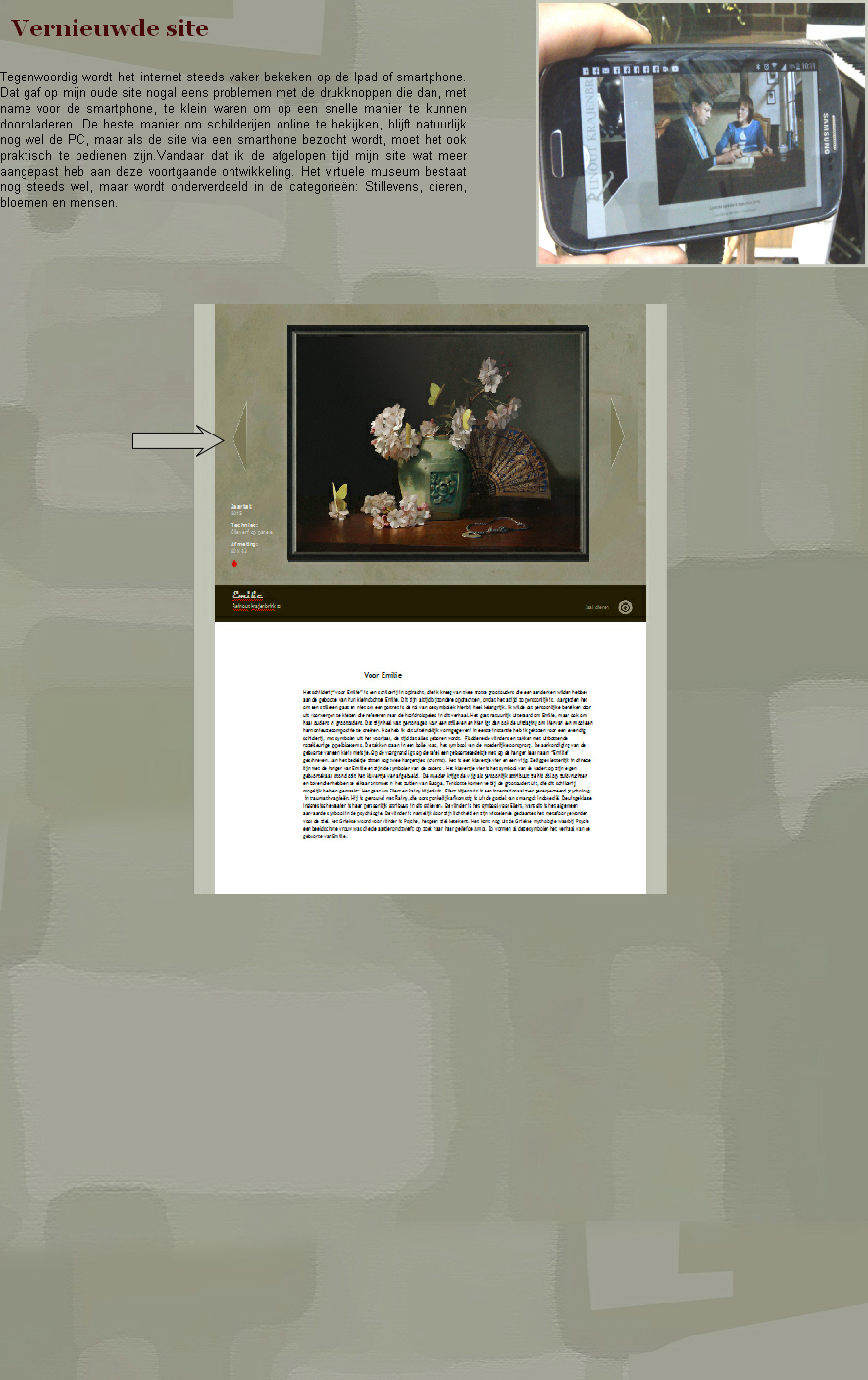 Het was een hele klus om de oude site in een nieuw jasje te steken. Er waren meer dan honderd pagina’s te vervangen. Toch is het concept van een virtueel museum gebleven, omdat ik dit nog altijd een hele leuke manier vind om mijn werk op een levendige manier te presenteren. Het was nodig om deze verandering door te voeren, omdat het websiteprogramma waarmee ik werkte toch wel gedateerd was en niet alle mogelijkheden bood voor een moderne site. Na een zomer voornamelijk gewerkt te hebben aan de expositie in galerie Lauswolt en de Artfair in Utrecht kon ik hier dus helemaal mijn tijd aan besteden.