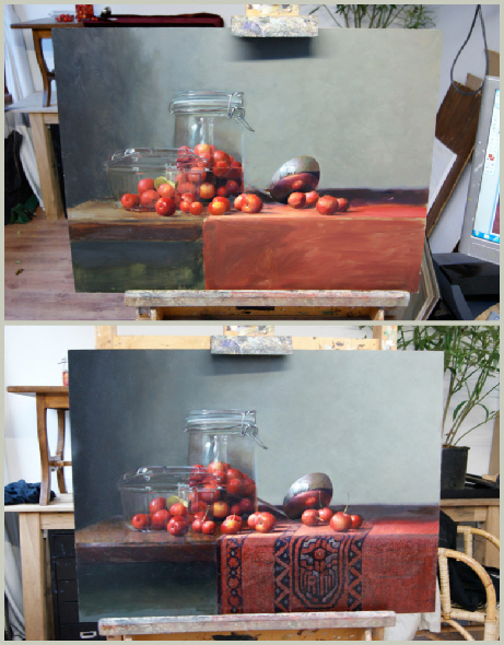 Vanwege zijn handzame formaat, leent deze vrucht zich heel goed om als opvulling te dienen of om ergens gewoon voor sier in te doen. Voor het maken van een compositie is dat reuze handig omdat hier heel gauw bijpassende voorwerpen bij te bedenken vallen. Bijvoorbeeld voor de inhoud van een weckfles in dit geval. Ook vond ik het leuk om weer een eigentijds voorwerp in de compositie op te nemen in de vorm van een plastic bakje. Hiernaast zijn twee schilderfasen zichtbaar: linksboven laat de fase zien waarin de kleuren in hoofdlijnen geschilderd zijn, maar details nog ontbreken. De foto eronder laat de details wel zien.