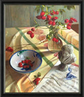 Appassionata, een schilderij dat een stilleven toont met felrode rozenbottels in