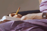 schrijft ze de gebeurtenissen van de dag op in haar boek. Haar benen zijn op getrokken