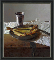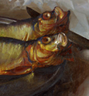 Het is al lang geleden dat ik een visstilleven heb gemaakt. Mijn eerste schilderij als beginnend kunstenaar was nota bene een schilderij met vissen, maar daarna heb ik het niet zo vaak meer geschilderd. Totdat ik onlangs op de vismarkt liep en gefascineerd werd door de prachtige gouden gloed op een stel gerookte haringen. Dit moest het thema worden van een nieuw schilderij. Zoals ik altijd doe aan het begin van zo’n schilderproces, is dat ik me eerst in het thema verdiep. Wat wil ik met dit schilderijtje vertellen? Al lezende boeide mij het meeste de vis in de Christelijke symboliek. Deels vanwege mijn achtergrond misschien, maar meer nog vanwege de mystiek. De vis neemt namelijk een hele belangrijke plaats in het Christendom. Tijdens de grote vervolgingen in de Romeinse tijd, gebruikten de eerste christenen het visteken als geheime symbool om aan te geven dat je een Christen was. De beginletters van