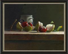 De kastanje is voor de schilder een geliefd object om te schilderen. De kastanje heeft namelijk heel veel verschillende kanten die het object boeiend kunnen maken. Allereerst de mooie roodbruine kleur van de kastanje, die prachtig contrasteert met de groene kleur van de bolster. Maar ook het gladde zacht glimmende oppervlak van de herfstvrucht die zo sterk verschilt met de stekelige huid van zijn gastheer. De schilder probeert in dit schilderij die aspecten naar voren te brengen, door ze van dichtbij te schilderen en te plaatsen in een helder