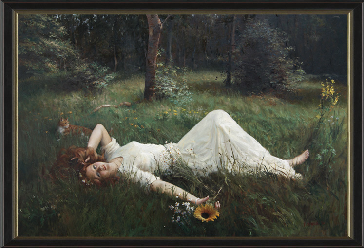 De tentoonstelling had het thema “Betoverd door vrouwen” en dat mag je inderdaad van Waterhouse wel zeggen. Het vrouwelijk model staat centraal in zijn werk en zijn personages laten zich voornamelijk kenmerken door de bleke huid en het rode haar. Misschien gebruikte hij wel vaker hetzelfde model,vandaar, maar alleen al aan de personen kun je haast zien of het een schilderij is van Waterhouse. Ik bezocht de tentoonstelling in 2009 met een goede vriendin, Gradeke, waarvan het grappige is dat bijna haar hele gezin roodharig is. Wat wil je ook, als de vader roodharig is . Haar dochter Martine, was misschien nog wel het meest gelijkend op één van de modellen van Waterhouse en vanaf dat moment ontstond bij haar het idee om daar een schilderij van te maken en als ouders cadeau te schenken op haar 16e verjaardag. Ze was echter nog geen 16 dus daar moest nog wel even 2 jaartjes op gewacht worden. In die tussentijd kon er mooi gebroed worden in welke hoedanigheid zij op het paneel vastgelegd kon worden. Moest het nu liggend of juist staand, in ieder geval zouden er veel bloemen op moeten komen en zou de sfeer heel ontspannen moeten zijn. Een “dolce vita” gevoel, aangezien Martine soms ook zo ontspannen er bij kan liggen. Waterhouse had regelmatig vrouwelijke modellen in ontspannen sfeer geschilderd, dus zelfs daarin voldeed ze als een goed model.