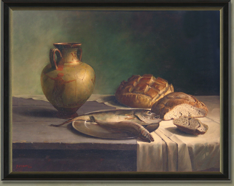 het schilderij zien we de twee vissen liggen, maar we zien slechts twee broden. De andere drie broden zijn op de Etruskische vaas te