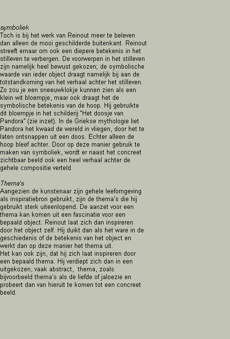 Zolang Reinout Krajenbrink nog geboeid raakt door de schoonheid van de dingen die gemaakt zijn door de mens of de natuur, blijft hij deze met veel enthousiasme schilderen. Hij probeert die mooiheid van de kleinoden, die vaak in deze drukke tijd vergeten worden, weer onder de aandacht te krijgen door ze d.m.v. subtiel lichtval en uitgebalanceerde composities te accentueren in gedetailleerd realistisch geschilderde stillevens, waardoor je bijna gedwongen wordt even hierbij stil te staan.