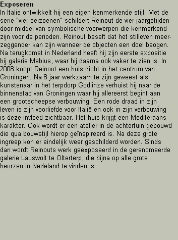 Tijdens zijn studietijd verblijft Reinout regelmatig in het buitenland. In het jaar ‘93-’94 doet hij een internationale ervaring op van 6 maanden op The College of the Ozarks in Missouri (VS), waar hij painting classes volgt en verantwoordelijk is voor de decorbouw in het theater. Na zijn Minerva-tijd krijgt Reinout de VSB-beurs 1999 uitgereikt voor een studieproject van een jaar in Italië. Aan de hoog aangeschreven Accademia Di Belle Arti Pietro Vannucci in Perugia doet hij onderzoek naar de oude Italiaanse meesters en verdiept zich verder in de klassieke schildertechniek.