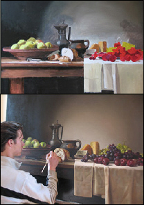 Nadat ik met acryl de eerste kleuropzet heb gedaan, komt dan uiteindelijk de olieverffase. Het kleurenpalet is ook veel groter, dan het acrylpalet. Deze fase dient ervoor om het schilderij body te geven. De voorwerpen worden dan verder uitgewerkt: naar gelang de textuur van het object met penseel tot paletmes.