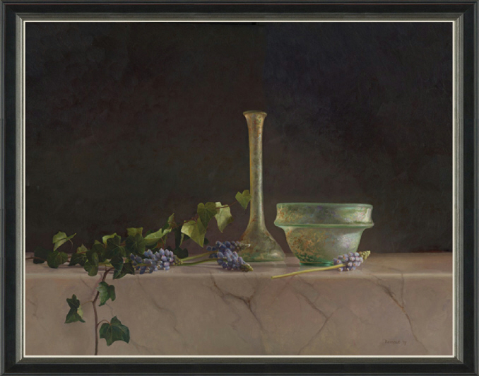 Ik vond de kleur blauw van de blauwe druif erg mooi in combinatie met de kleur van het glas. Meng je namelijk dat blauw van die blauwe druif met het groen van de klimop, dan krijg je namelijk de kleur van het glas. Verder zie je dat blauw ook expliciet terugkomen in het glasoppervlak. Het schilderij heeft door die kleureenheid een monochroom karakter, dat echter doorbroken wordt door oranjebruine tinten in het glas die subtiel contrasteren met die overwegend groenblauwe kleurschakeringen.