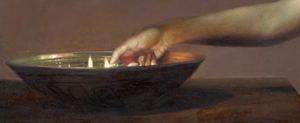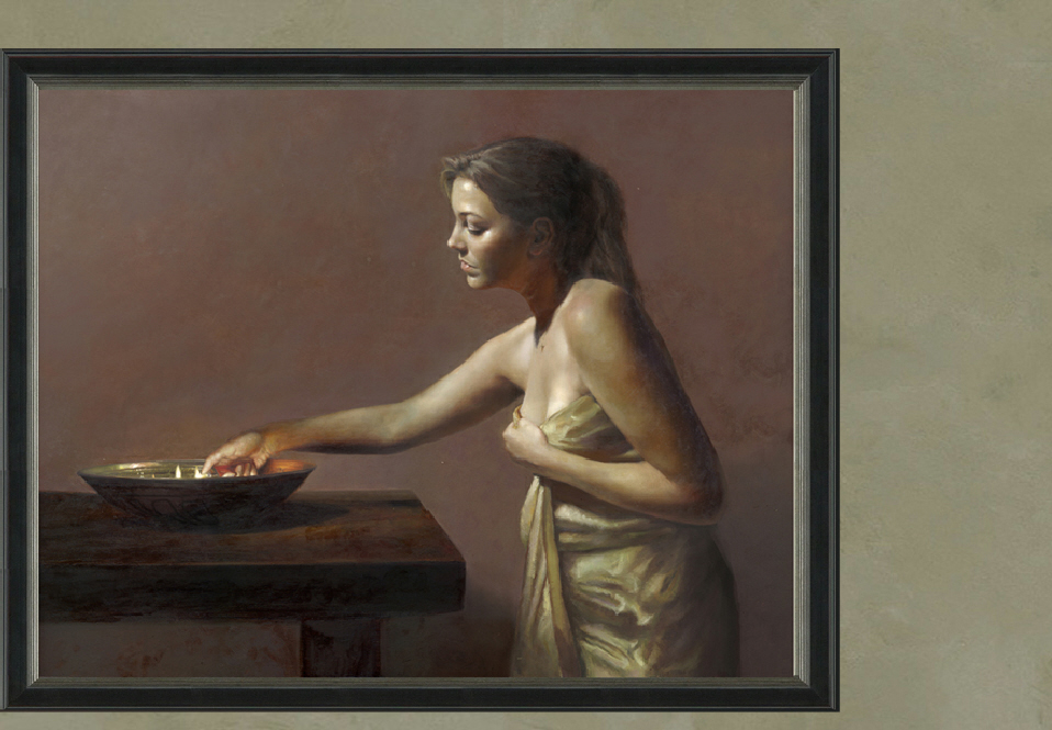 We zien hier op het schilderij een jonge vrouw die aandachtig enkele kaarsen in een schaal ontsteekt en daarbij met haar linkerhand een zijden omslagdoek vasthoudt. Het gaat hier om iemand die een ander persoon verwacht. Dat blijkt ook wel uit de handeling die ze doet. Ze heeft zich net gedoucht en is nog niet aangekleed. Ze ontsteekt alvast enkele kaarsen om een gepaste sfeer te creëren. Het ontsteken van kaarsen is het metafoor voor het ontsteken van de passie, het opwekken van vuur en energie. Niet voor niks beginnen veel romantische avonden met het ontsteken van kaarslicht. Het gele flakkerende licht werpt een oranje gloed op haar hand en reflecteert ook op haar hals. Een ander feller licht schijnt op haar gezicht, maar met name op haar boezem, die daarmee de sensualiteit benadrukt. Het schilderij heet “Verwachting”en in dat woord schuilt echter ook een onzekerheid. Met verwachten ga je ergens van uit, echter of het ook zo uitkomt is afhankelijk van de ander. Een brandende kaars staat dan wel voor vuur en passie, de eigenschappen dat een kaars maar kortstondig brandt en gemakkelijk te doven is, is ook een metafoor voor eenzaamheid en verlangen van de ziel. Het moment dat je iemand verwacht is altijd een beetje een spannend moment, pas wanneer die persoon er is valt die spanning weg. De blik van de jonge vrouw is geconcentreerd, ze is van de zijkant geschilderd en zij steekt een arm uit om de kaarsen aan te steken. Hierdoor ontstaat een leeg vlak voor haar in de compositie. Een metafoor voor de leegte, die zij op dat moment misschien kent, waarvan zij verwacht dat die opgevuld zal worden door de persoon die komen gaat. De persoon die zij verwacht.