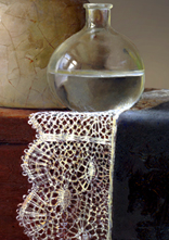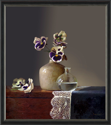 Dit is één van de laatste in de serie van schilderijen met viooltjes. Deze keer met een iets andere achtergrond dan bij de vorige. Toch is de symboliek van de nederigheid en bescheidenheid, die het viooltje met zich meedraagt, een centraal motief in al die schilderijen. De uitzonderlijke kleurenpracht van deze bloem die zich maar zo bescheiden in grootte manifesteert, heeft uiteraard aan deze betekenis bijgedragen. Maar in dit schilderij gaat het dit keer niet om het viooltje, maar meer om een kleine ode aan mijn moeder. De basis van dit schilderij lag bij het feit dat ik wat kantkloswerk van mijn moeder onder ogen kreeg, dat ze onlangs had vervaardigd. Het was prachtig en heel kunstig gemaakt. Er zaten ongetwijfeld vele uren werk in, maar toen ik vroeg wat ze er mee ging doen, kwam het er uiteindelijk op neer dat het wel in een la zou eindigen. En dat voor zo’n waardevol stukje kant. Dat is een beetje mijn moeder ten voeten uit: bescheiden in haar opstelling, maar wel tevreden over het werk wat is gedaan en dat geldt eigenlijk met alles wat ze doet. Net zoals het viooltje, dat prachtig is in haar schoonheid, maar een bescheiden rol neemt in het geheel. Tevreden met een rol in de luwte. Vandaar dat ik in dit schilderijtje mijn moeders kant eens iets wil uitlichten. Die bescheidenheid wordt niet alleen uitgebeeld in de viooltjes maar ook in de bescheiden compositie. Deze is vrij sober en ingetogen gehouden, we zien links twee bloemen op de tafel liggen, één daarvan ligt iets in de schaduw, ze staan symbool voor mijn ouders. Rechts daarvan staat een aarden vaasje met vier violen er in. De vaas is het symbool van moederschap. Het ontleent zijn betekenis aan de omsluitende vorm, ook wel geassocieerd met de baarmoeder. Uit deze vaas komen dus vier bloemen die haar vier kinderen symboliseren. Het schenken van leven wordt nog eens extra benadrukt door het glazen vaasje met water er in. Water het symbool van de bron van leven. Dit vaasje staat dan ook op de gekantkloste zoomband van het tafelkleed. Dit is het kant wat mijn moeder onlangs vervaardigde. Niet eindigend in een la, maar het is nu de basis waarop dit stilleven staat. En het wordt nog even extra belicht door het licht wat door het glazen vaasje heen valt en opschijnt aan de onderkant. Het kant vormt als het ware een inleiding op het stilleven en daarmee heb ik een beetje geprobeerd om mijn moeder, maar ook haar onderschatte werk te eren en te waarderen in dit bescheiden schilderijtje. Vandaar dat ik dit stilleven ook de titel gaf: Mijn moeders kant.